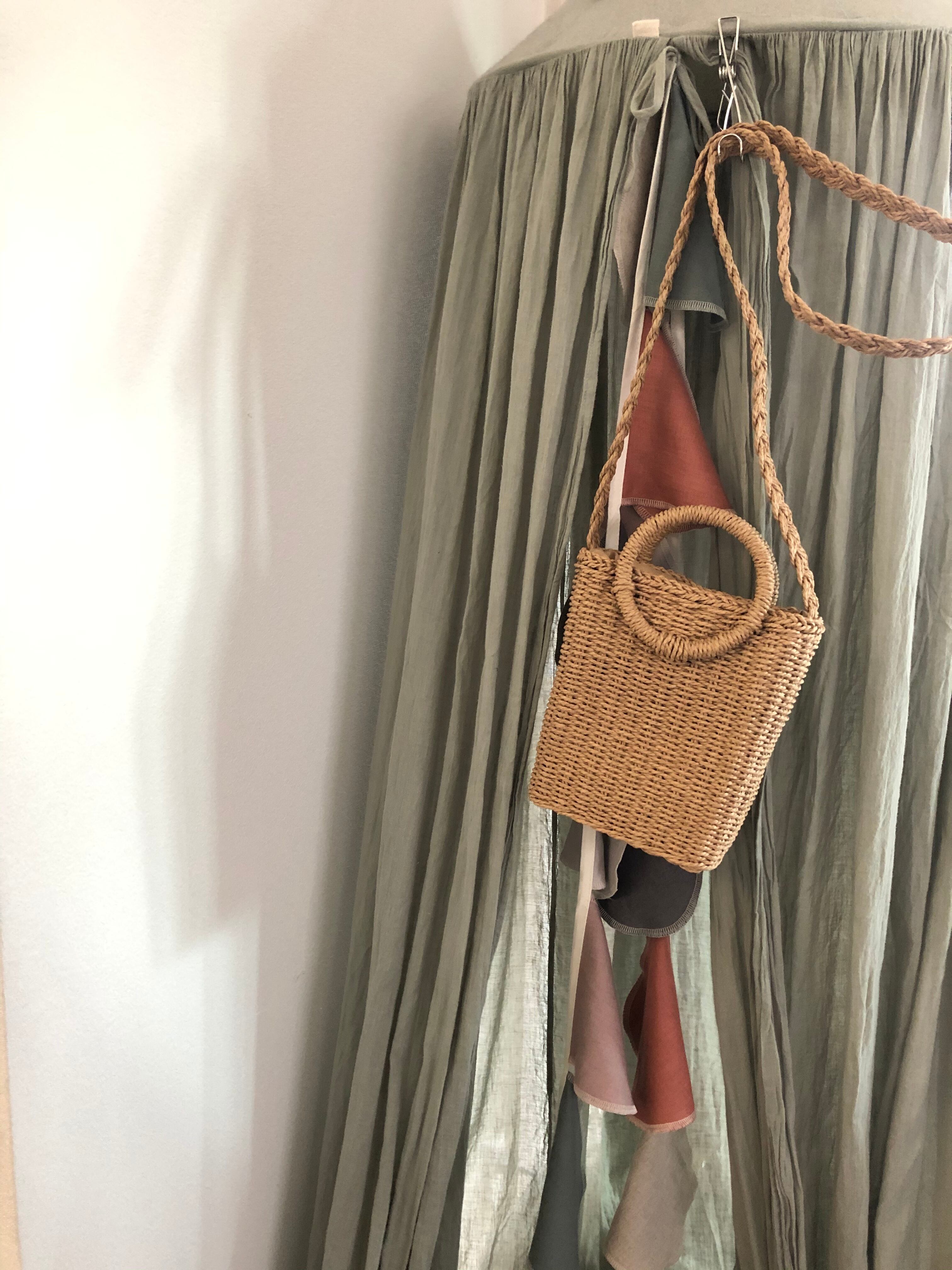 お子様が持つときは、肩のあたりで一度結んで長さを調整してください。